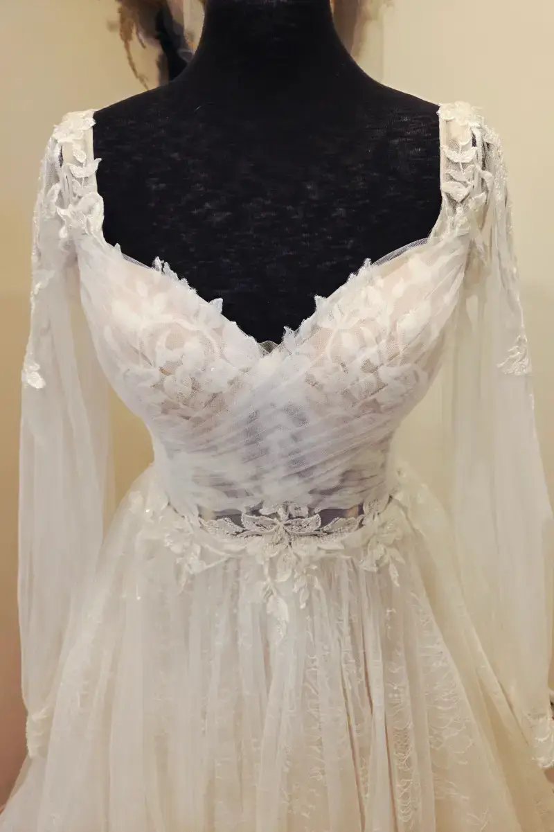 Découvrez la robe Christie, un chef-d’œuvre de romance et de sophistication. Ses manches longues amovibles vous offrent deux styles en un, tandis que son buste en transparence drapé sublime votre silhouette avec délicatesse. La jupe en tulle et dentelle ivoire-nude apporte une touche de légèreté et de raffinement, pour une allure à la fois moderne et intemporelle.